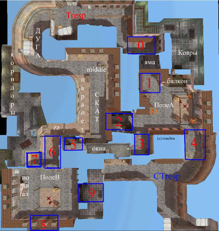 1) Просмотрите карту: de_dust2 Карта de_dust2 считается самой популярной по рейтингу картой в мире CS 1.6. Таким образом мы её рассматриваем первой. Карта de_dust2 состоит из 9 зон, 5 точек B и 4-ёх точек A. Зоны обведены синей линией, а точки также помечены синим цветом, но с надписью того или иного номера точки (A или B). de_inferno :