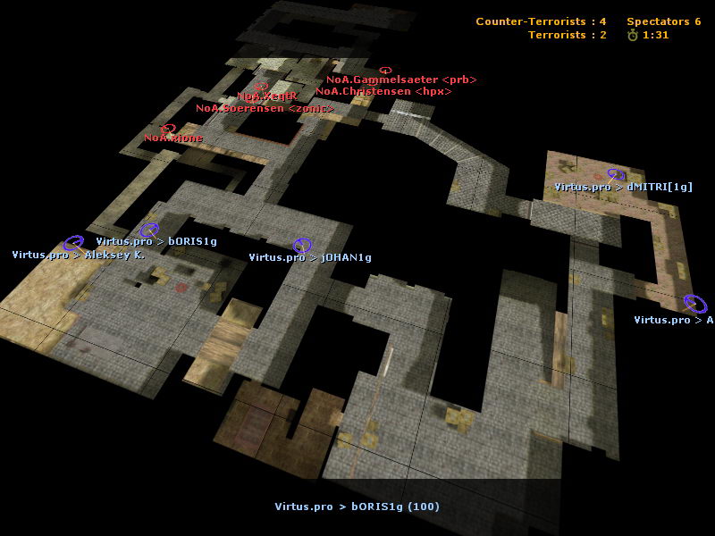 Тактика команды Virtus.pro на карте de_inferno На этой странице вы сможете прочитать о тактике и стратегии на карте de_inferno известной Русской CS команды Virtus.pro. Стратегия команды Virtus.pro на этой карте является одной из самых насыщенных, в ней они демонстрируют манёвры, выводящие соперника из правильного понимания ситуации и обстановки. ![]() Насыщенность - так можно обозначить почти все стратегии Virtus.pro, в том числе и те, что команда использует на de_inferno. Быстро приспосабливая множество самых разнообразных задумок и комбинаций под уже существующие стандартные схемы, Virtus.pro способны нанести своему сопернику поражение, прежде чем он успеет разгадать, а главное понять принцип игры команды. Создавая постоянное давление вокруг обоих плэнтов на протяжении почти всего раунда, эти стратегии становятся весьма успешными. Активные и решительные действия в атаке заставляют соперника по нескольку раз сомневаться в правильности выбранного метода защиты. Именно это и играет для соперника роковую роль и упрощает задачу Virtus.pro. В защите, Virtus используют раши с агрессивной игрой. Зарабатывая быстрые фраги, команда сохраняет давление на оборону соперника, постоянно меняя позиции, чтобы избавится от дыр в линии атаки. ![]() Inferno Offense Характерный шум и многочисленные активные действия заставляют соперников Virtus.pro быть в постоянных догадках о действиях команды. Типичным вариантом атакующей стороны команда выбрала медленные атаки, в отдельных случаях игроки позволяют событиям решать дальнейшее развитие ситуации. Pistol Round Так же как и в случае с большинством тактик команды, пистолетный ранд начинается медленно, с методичным расчетом возможных атак на ключевые точки, таких как окно или middle. jOHAN, приобретший USP и FB, занимает позицию в яме, наблюдая за любыми потенциальными атаками. Тем временем все остальные члены команды проходят длинной и работают на middle. ![]() Команда продолжает медленно продвигаться на плэнт "А", а трое членов команды с бомбой проходят коврами. Тем временем, jOHAN работает на middle, где встречает dMITRI, у которого есть SG. dMITRI бросает SG в 6, а две FB в 7 и 8, после чего начинается одновременная атака с middle и ковров. ![]() ![]() Когда плэнт "А" захвачен, dMITRI в окнах ожидает каких-либо перегруппировок соперника через middle, а вся команда прикрывает все подходы к бомбе. ![]() Anti-Eco Этот раунд заключается в надежном прикрытии и обзоре командой важнейших точек: дуги, middle, окон и ковров. Вначале двое игроков - b0RIS и jOHAN - проходят длинной и следят за окнами и коврами. Остальные члены команды занимают позиции у ямы, предупреждая тем самым фаст-фраговые (быстрые) вылазки соперника. ![]() Когда dMITRI проходит на дугу, Aleksey K. и Aleksey N. смотрят разные стороны middle. ![]() ![]() Раш не следует, двое членов команды проверяют плэнт "Б" на наличие там больших сил противника. Если у команды будут подозрения на скопление превосходящих сил противника, эти двое отходят к middle, после чего начинается совместный штурм. ![]() Economy Round Этот раунд команда проводит с Desert Eagle'ами. Все игроки идут длинной, в ожидании атаки противника. ![]() Так же, как и в обычных раундах, dMITRI подсадит jOHAN в окна, чтобы тот подкрался и, возможно, сделал фраг. После этого dMITRI идет на ковры. ![]() Aleksey K. проходит к middle, использует свои FB, чтобы начать атаку всей команды на плэнт "А". ![]() Default Почти все стандартные тактики Virtus.pro основаны на этой схеме игры. Используя ее